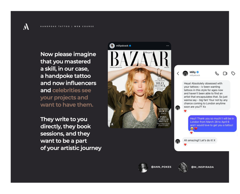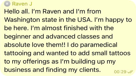 Isa has already been tattooing for four years, but wanted to refine her work and deepen her skills. Our course helped me recognize what she was doing right and where she could improve. Now, she run her own studio with full confidence, style, and artistic direction.