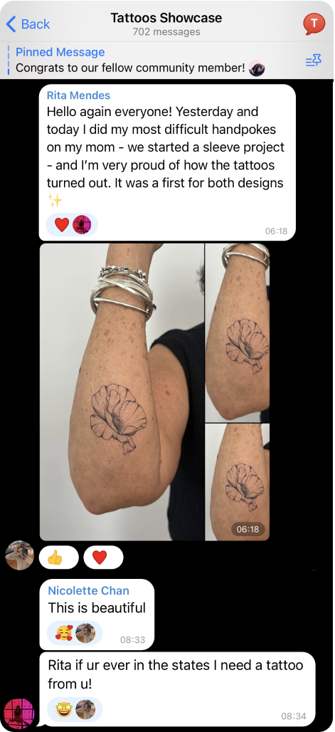 Sophie was searching for a way to express herself, but didn’t know how to do that within tattooing. When she discovered handpoke, she was mesmerized and took our course. Now, she has her own unique style, understands her craft deeply and I feel confident.